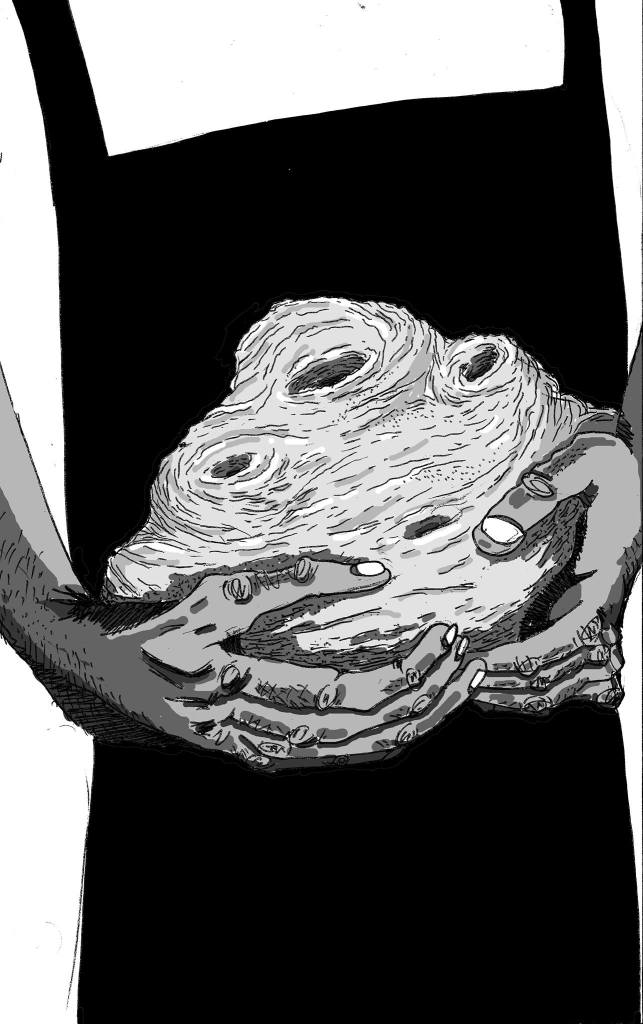 Denna storköks-kortis av Henrik Johansson påminner om berättelsen Julvört. Där är det bageriarbetarna som ”sätter likhetstecken mellan ‘vi, arbetarna’ och ‘vi, brödätarna’, som om båda vore vi. […] så vägrar vi acceptera att någon annans intressen tränger sig emellan oss och oss.”