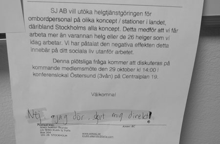 En ny ledning hade tagit över SJ. De kom från SAS och McDonalds. Deras uppdrag var att skapa vinster. De var slaktare. Ombord på tågen pratade vi om ”cheferna från flyget”. De visste fan ingenting om hur tågtrafiken fungerade. Och nu hade de nya cheferna bestämt att vi i Stockholm skulle jobba ännu fler helger. Men vi jobbade redan varannan helg! Tyckte redan att det var för mycket. Genom att att vända och vrida på några meningar i kollektivavtalet tyckte cheferna att vi kunde jobba ännu mer. Vår fackförening höll inte med. Det kallades till nya förhandlingar.