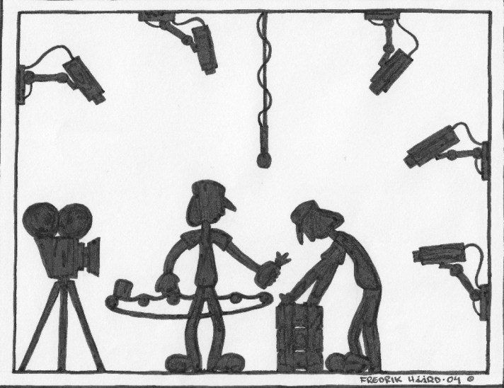 Här har vi en illustration till en artikel om kameraövervakning på arbetsplatsen. Övervakning och kontroll av hur arbetarna utför arbetsuppgifterna är och var ett ständigt återkommande gissel i fabriken.