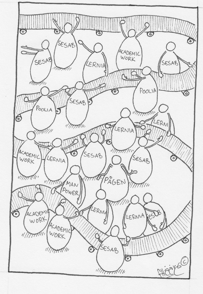 Återkommande förhandlingar i frågan om bemanningsföretag resulterade i att tidningen publicerade illustrationen vi här vilar ögonen på. Företaget propsade vid ett flertal tillfällen på att ta in bemanningsföretag, trots att de samtidigt propsade på att vi hade en övertalighet. I nästan 15 år vet vi att företaget ständigt pratat om att vi var för många i fabriken. Ändå var bemanningsföretag en fråga värda att tjata om tills tidningen tog upp det. Och förmodligen tjatar de fortfarande om såväl övertalighet som bemanningsföretag.